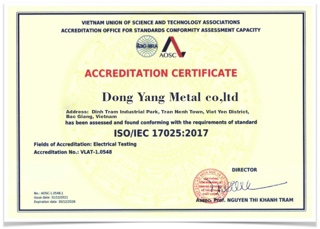 This accreditation certificate boasts high gold value, as it adheres to ISO/IEC 17025:2017—the internationally authoritative standard for laboratory competence—and is issued by the Vietnam Union of Science and Technology Associations' Accreditation Office for Standards Conformity Assessment Capacity (AOSC), a prestigious accreditation body in Vietnam. It verifies that Dong Yang Metal Co., Ltd., based in Dinh Tram Industrial Park, Vietnam, has met the rigorous requirements for Electrical Testing. With an accreditation number of VLAT-1.0548 and a document number of AOSC 1648-1, this certificate remains valid from October 31, 2021, to October 31, 2026, serving as solid proof of the company's reliable competence in providing electrical testing services.